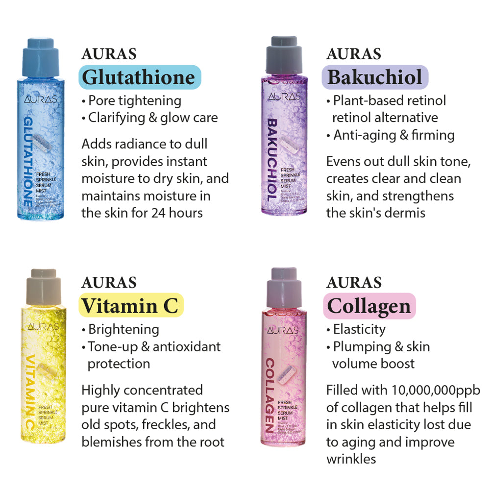 AURAS Fresh Sprinkle Serum Mist 60ml – Oxygen Bubble Glow Mist with Bakuchiol, Collagen, Vitamin C, Glutathione